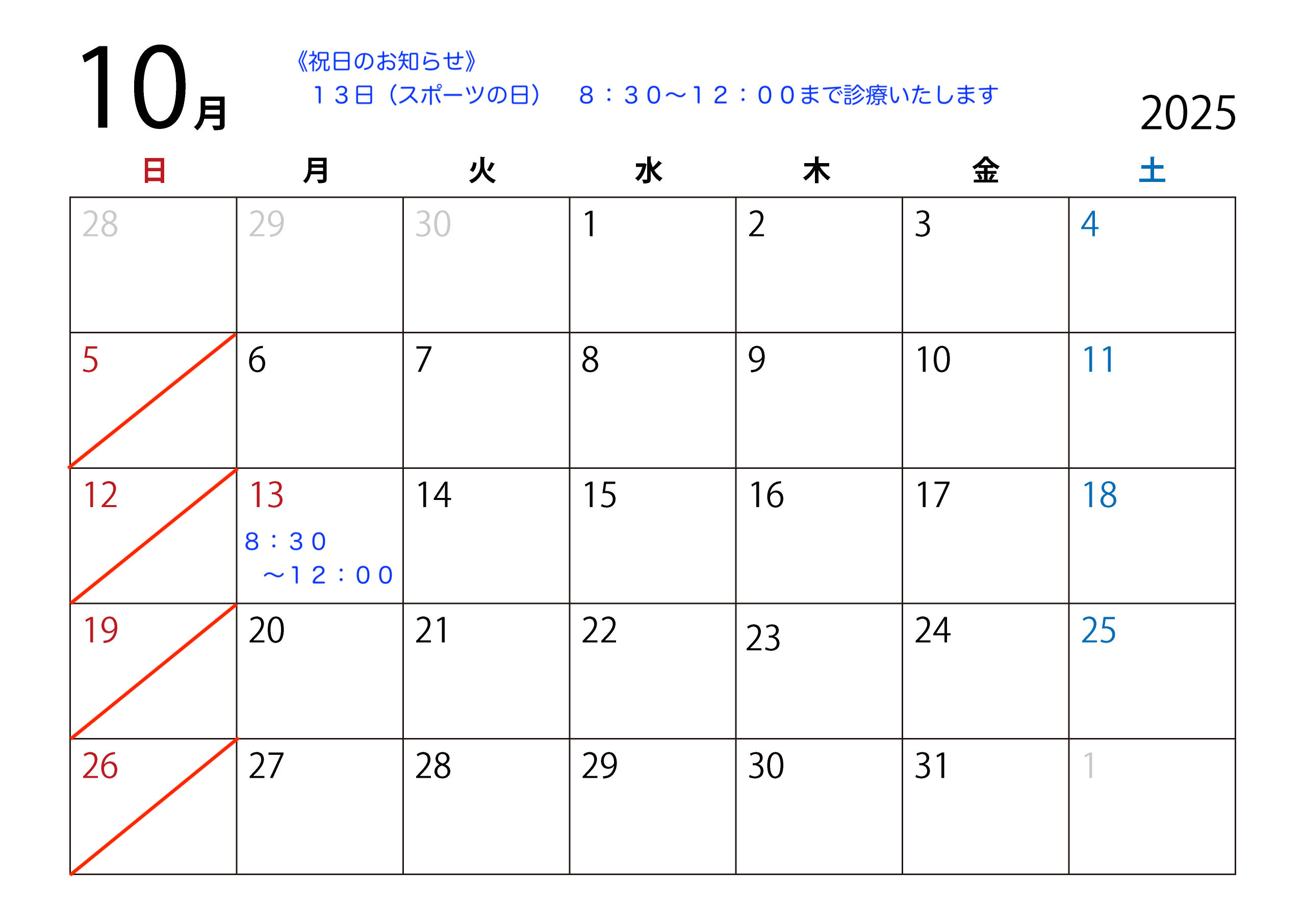 10月13日(祝・月) 8:30〜12:00まで診療させて頂きます。